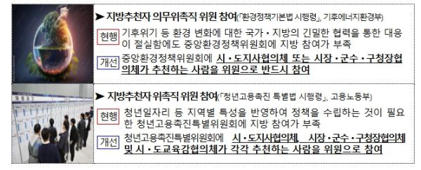 개정안의 주요사례를 보면, 중앙환경정책위원회와 같이 국가적 과제나 지방정부와 긴밀한 협력이 필수적인 정책을 논의하는 정부위원회에 지방에서 추천한 사람이 위원으로 반드시 참여하도록 제도화했다.