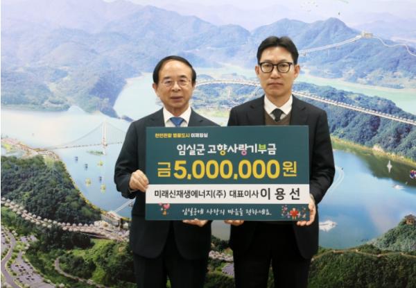 [중앙뉴스라인, 김용범기자] 임실군이 지난 15일 미래신재생에너지(주) 이용선 대표가 지역사회 발전과 주민 복리 증진을 위해 고향사랑기부금 500만원을 기탁했다고 밝혔다.