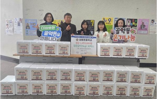 [중앙뉴스라인, 김민수기자] 성황초등학교가 지난 19일, 광양시 골약동지역사회보장협의체(공공위원장 박순옥, 민간위원장 정용태)에 학교 나눔 장터 수익금과 김장김치 30박스를 기탁하며 이웃사랑을 실천했다.