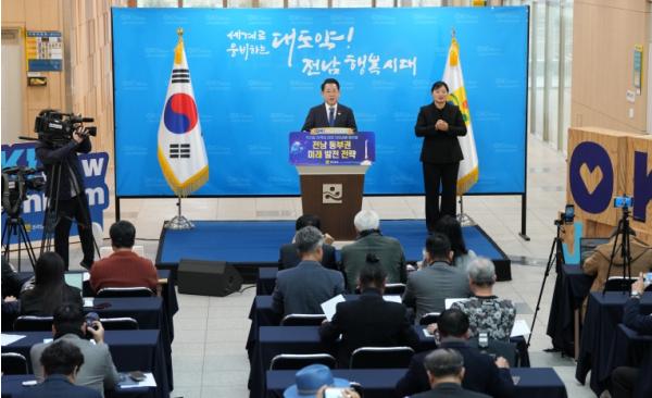 [중앙뉴스라인, 김민수기자] 김영록 전라남지사는 24일 동부지역본부에서 열린 동부권 송년 기자 브리핑에서 2026년을 ‘동부권 100년 대도약의 원년’으로 선포하고 전남 미래 성장의 핵심 거점으로 육성하는 동부권 발전 전략을 발표했다.