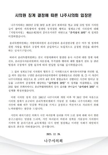 [중앙뉴스라인, 전은희기자] 나주시의회는 2025년 12월 26일 오전 10시 본회의를 열고, 10월 15일 일부 시의원들이 참여한 카톡방에서 발생한 부적절한 행위로 징계요구된 시의원에 대해 '지방자치법' 제44조제2항의 품의유지의무 위반으로 ‘출석정지 10일’의 징계를 의결하고 입장문을 발표했다.