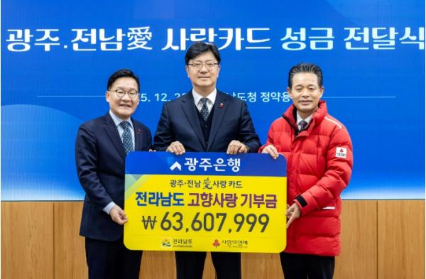 [중앙뉴스라인, 양병남기자] 광주은행은 26일 전남도청에서 열린 ‘광주·전남愛사랑카드 고향사랑 기부금 전달식’에 참석해 전남지역 복지사각지대 해소를 위한 고향사랑기부금 6,360만 원을 전달했다고 밝혔다.