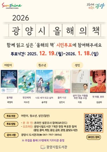 [중앙뉴스라인, 김민수기자] 광양시가 오는 12월 29일부터 내년 1월 18일까지 ‘2026 올해의 책’ 선정을 위한 시민투표를 실시한다.
