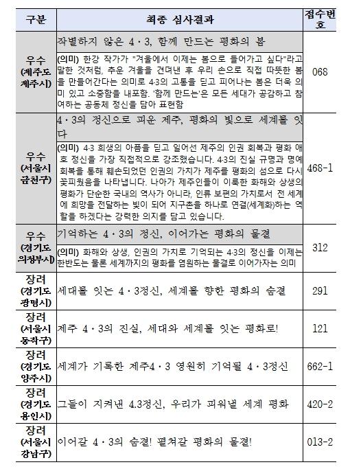 장려작으로는 ‘세대를 잇는 4·3정신, 세계를 향한 평화의 숨결’, ‘제주4·3의 진실, 세대와 세계를 잇는 평화로!’, ‘세계가 기록한 제주4·3 영원히 기억될 4·3정신’, ‘그들이 지켜낸 4·3정신, 우리가 피워낼 세계 평화’, ‘이어갈 4·3의 숨결! 펼쳐갈 평화의 물결!’ 등 5편이 선정됐다.