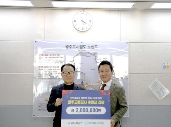 [중앙뉴스라인, 양병남기자] 광주교통공사가 최근 광주시 서구 마륵동 본사에서 (사)한국 백혈병소아암협회 광주전남지회에 임직원들이 정성으로 모은 성금 200만 원을 전달하며 환아들의 따뜻한 연말연시를 기원했다.