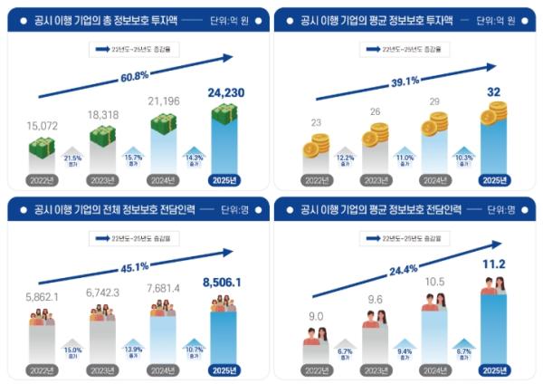 2025년 정보보호 투자액(2조 4,230억원)은 전년 대비(2조 1,196억원) 14.3% 증가했으며, 정보보호 전담인력(8,506.1명)은 전년 대비(7,681.4명) 10.7% 증가한 것으로 나타났다.