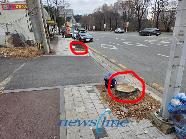 [중앙뉴스라인 = 전은희 기자] 2025년 12월 말 광주광역시 북구 양산동 양산저수지 건너편 도로변에서 가로수 3그루가 베어진 상태가 확인됐다.
