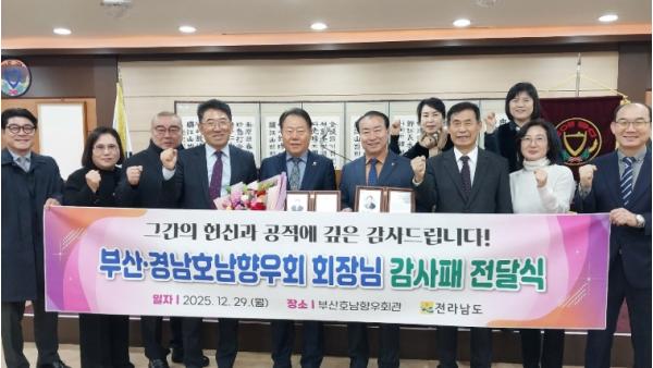 [중앙뉴스라인, 김민수기자] 전라남도는 부산호남향우회관에서 각별한 애향심으로 고향사랑실천에 앞장 선 부산호남향우회 조용서 회장과 경남호남향우회 이병철 회장에게 지난 12월 29일 감사패를 전달했다고 밝혔다.