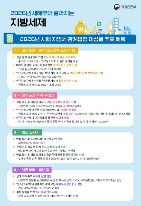또한, 인구감소지역 내 창업·사업장 신설 시 부동산 취득세·재산세 면제(5년간, 이후 3년간 재산세 50% 경감) 대상 업종을 기존 32개 업종에서 신재생에너지업, 의료업, 야영장업 등을 추가한 40개 업종으로 확대한다.