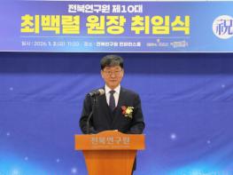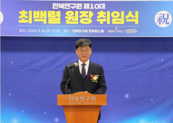[중앙뉴스라인, 김용범기자] 전북연구원 제10대 최백렬 원장은 1월 2일 전북연구원에서 취임식을 갖고 본격적인 업무를 시작했다. 임기는 2026년 1월 1일부터 2028년 12월 31일까지부터 3년이다.