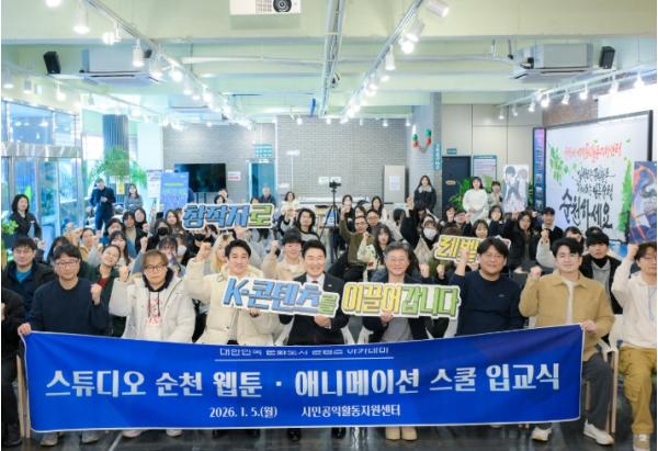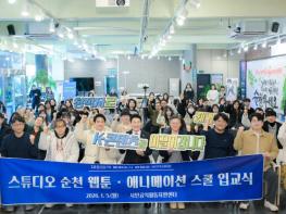 [중앙뉴스라인, 전은희기자] 순천시는 지난 5일 시민공익활동지원센터에서 ‘스튜디오 순천(Studio Suncheon)’ 웹툰, 애니메이션 스쿨 입교식을 개최하고, 지역기반 문화콘텐츠 핵심인재 양성을 위한 본격적인 교육을 시작했다고 밝혔다.