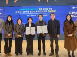 시와 전북대 첨단모빌리티 사업단(사업단장 이덕진 교수)은 6일 전주국제드론스포츠센터에서 임숙희 경제산업국장과 이덕진 단장 등 양 기관 관계자들이 참석한 가운데 전주국제드론스포츠센터를 활용한 드론 분야 상호 협력을 강화하는 내용의 업무협약을 체결했다.