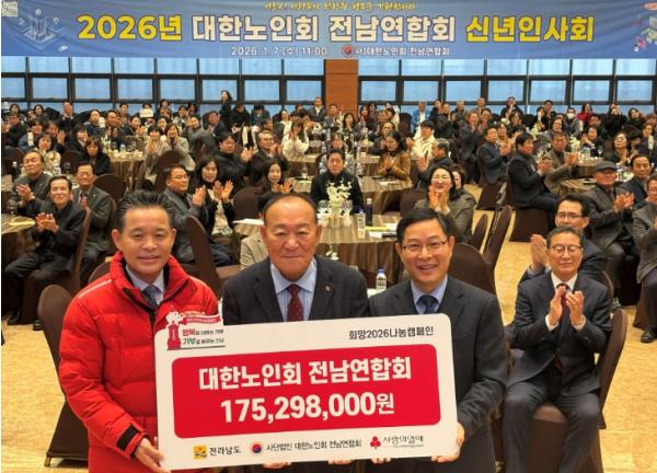 7일 무안 스카이웨딩컨벤션에서 열린 2026년 대한노인회 전남연합회 신년인사회에서 진행된 기탁식에는 정광선 전남도 보건복지국장, 김동극 전남사회복지공동모금회 사무처장, 정양수 대한노인회 전남연합회장을 비롯한 22개 시군 지회장 등 200여 명이 참석했다.
