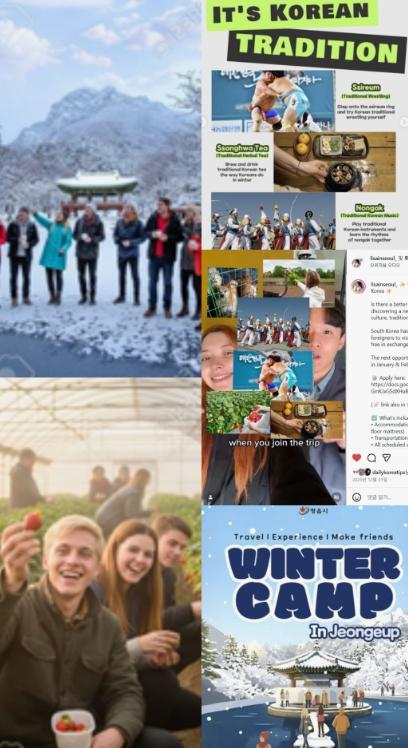 또한 겨울 농촌 체험과 전통문화 습득 등 다양한 활동에 참여하며, 개인별 사회관계망서비스(SNS) 콘텐츠 제작과 팀별 과제(프로젝트)를 통해 글로벌 청년의 시각으로 정읍 관광을 국내외에 알리는 홍보대사 역할을 수행할 예정이다.
