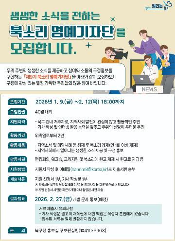 문인 북구청장은 “북소리 명예기자단은 주민이 직접 지역의 변화와 일상을 전하는 메신저인 만큼 이번 모집에 많은 관심과 참여를 바란다”며 “앞으로도 북소리가 주민과 행정의 소통 창구 역할을 할 수 있도록 다양한 지원을 아끼지 않겠다”고 말했다.