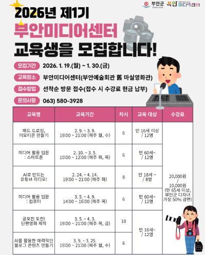 [중앙뉴스라인, 김용범기자] 부안미디어센터는 군민의 미디어 활용 역량 강화를 위해 2026년 제1기 미디어교육 교육생을 모집한다고 밝혔다.