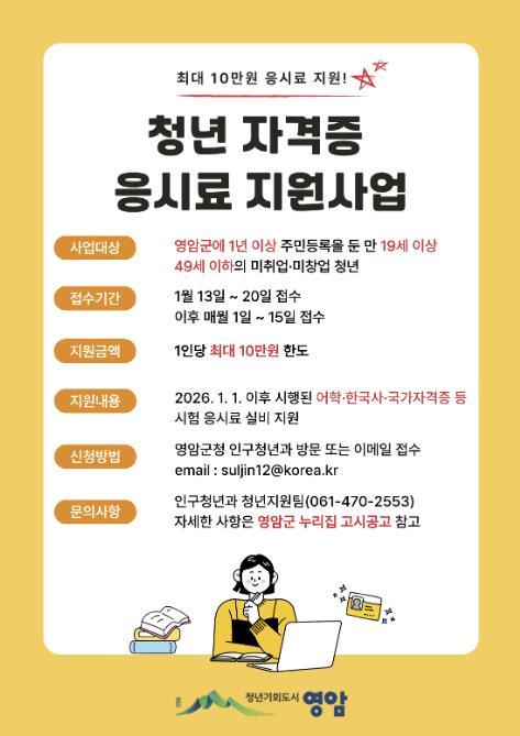 김선미 영암군 인구청년과장는 “청년 자격증 응시료 지원이 취업을 준비하는 청년을 지지하는 힘이 될 수 있도록 하겠다”고 말했다.