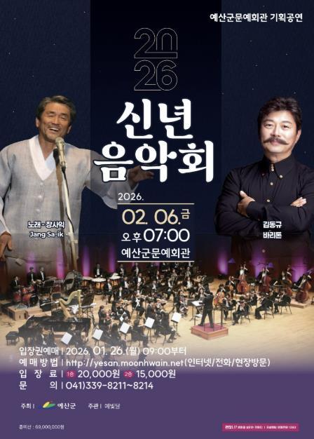[중앙뉴스라인, 우제헌기자] 예산군은 군민과 함께 희망찬 2026년 새해를 여는 ‘2026년 신년 음악회’를 오는 2월 6일 오후 7시 예산군문예회관 공연장에서 개최한다고 밝혔다.