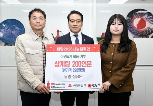 [중앙뉴스라인, 김용범기자] 남원시는 1월 15일 남원시 도통동에 소재한 음식점 삼삼돈(대표 왕홍석)에서 삼계탕 200인분을 기부했다고 밝혔다.