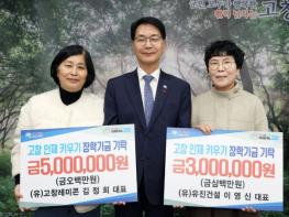 19일 고창군장학재단에 따르면 이날 고창친환경블루베리연구회(회장 백석기)에서 200만원, 성송면 이성진씨 100만원, ㈜고창레미콘 김정희 대표 500만원, ㈜유진건설 이영신 대표 300만원을 각각 기탁하며 지역 인재 육성에 뜻을 모았다.