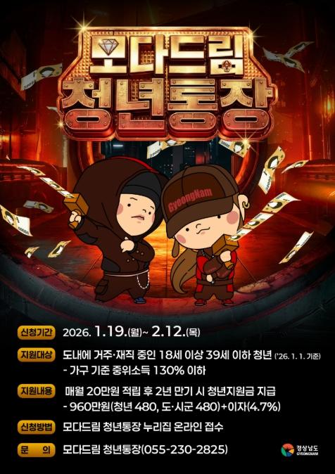 [중앙뉴스라인, 한장원기자] 경상남도와 경남투자경제진흥원은 청년의 자산 형성과 지역 정착을 돕는 ‘모다드림 청년통장’ 상반기 참여자를 1월 19일부터 2월 12일까지 모집한다고 밝혔다.