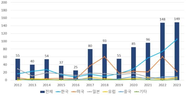 출원인 국적별로 살펴보면 출원량은 1위 한국이 43.1%(395건)으로 가장 많이 출원했고, 그 다음으로 2위 미국 28.4%(260건), 3위 일본 18.5%(170건), 4위 중국 4.6%(42건), 5위 유럽연합 4.1%(38건) 순이었다.