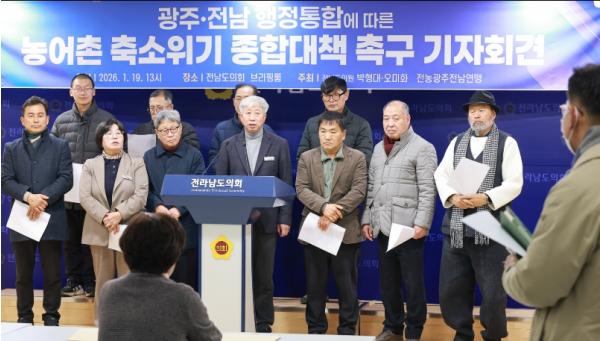 [중앙뉴스라인, 전은희기자] 전라남도의회 박형대 의원(진보당·장흥1)은 1월 19일 도의회 브리핑룸에서 기자회견을 열고 “광주ㆍ전남 행정통합 논의가 속도를 내고 있지만 농어촌 축소 위기에 대한 대비는 현저히 부족하다”며 농어촌 보호를 위한 구체적 합의를 요구했다.