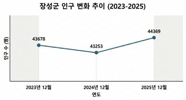 [중앙뉴스라인, 김민수기자] 장성군이 지방 소멸과 인구 감소 우려를 해소하는 유의미한 통계를 발표했다. 군에 따르면 지난해 12월 집계된 장성군의 인구는 4만 4369명으로, 1년 전보다 1116명 증가한 것으로 나타났다.