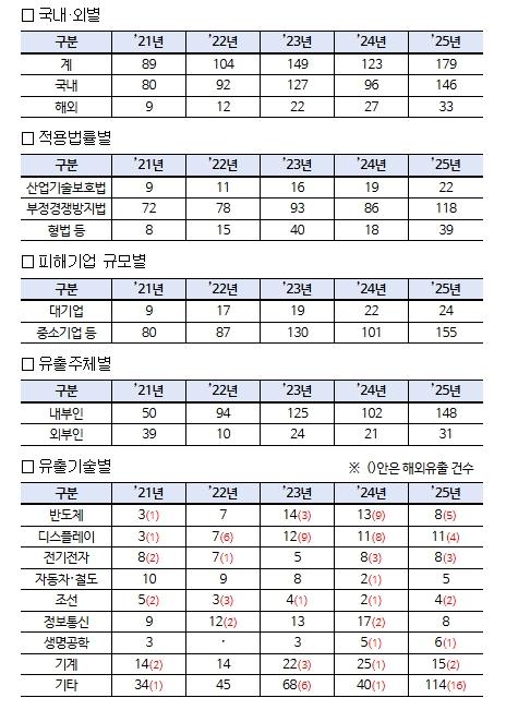 유출 기술별로는 ▵기계(15건, 8.3%) ▵디스플레이(11건, 6.1%) ▵반도체(8건, 4.5%) ▵정보통신(8건, 4.5%) ▵이차전지(8건, 4.5%) ▵생명공학(6건, 3.4%) ▵자동차·철도(5건, 2.8%) 등 순으로 나타났다.