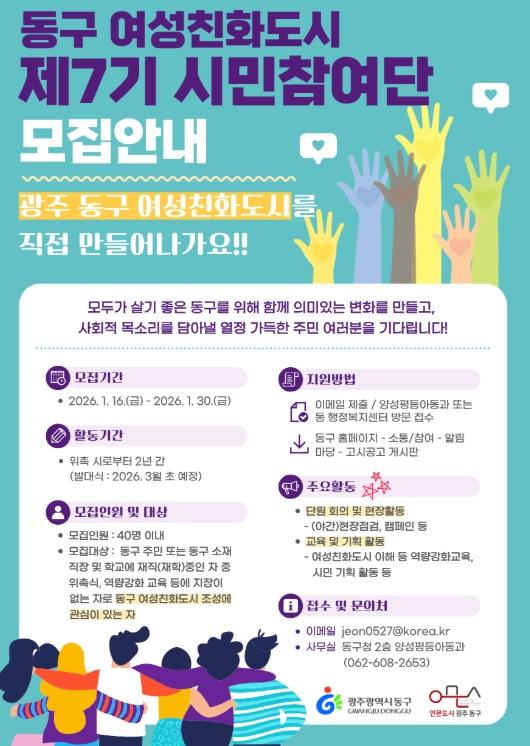 [중앙뉴스라인, 김민수기자] 광주 동구는 주민이 직접 참여해 여성친화도시 정책을 만들어가는 ‘제7기 동구 여성친화도시 시민참여단’을 이달 30일까지 모집한다고 밝혔다.