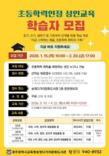 [중앙뉴스라인, 전은희기자] 광주시교육청송정다가치문화도서관은 ‘2026학년도 초등학력인정 성인교육’ 프로그램을 운영한다.
