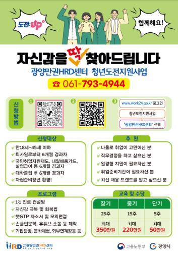 광양시 관계자는 “이번 청년도전지원사업이 취업 시장에서 멀어졌던 청년들에게 다시 한번 도전할 수 있는 계기가 되길 바란다”며 “프로그램 이수 후에도 국민취업지원제도, 일경험 사업 등 다양한 지원사업과 연계해 청년들이 안정적으로 취업에 성공할 수 있도록 적극 지원하겠다”고 밝혔다.
