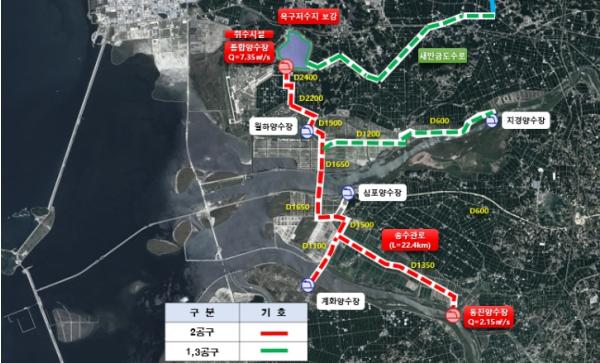 이 사업은 새만금 농생명용지에 안정적이고 지속적인 농업용수 공급을 위해 통합양수장 1개소 신설과 옥구저수지 보수‧보강, 송수관로 24.9km 등을 설치하는데 2,368억 원의 재정을 투입하는 사업이다.