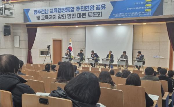 [중앙뉴스라인, 전은희기자] 광주시교육청은 23일 광주시교육청교육연수원 중강당에서 시민단체 및 교원단체와 공동으로 ‘광주·전남 교육행정통합 추진 현황 공유 및 토론회’를 개최했다.