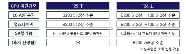 전문가 평가를 통해 선정된 추가 1개 정예팀에는 B200 768장(B200 512장, H100 512장과 유사한 성능) 규모의 GPU 자원 지원, 데이터 공동구매, 구축·가공 지원 등 지원과 함께, “K-AI 기업” 명칭을 부여하는 등 기존 정예팀과 동등한 수준의 지원을 제공해 글로벌 수준의 독자 AI 파운데이션 모델 개발 도전을 뒷받침할 계획이다.
