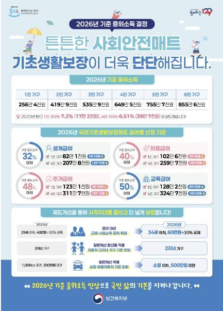2026년 기준 중위소득이 4인 가구 기준 전년 대비 6.51% 인상됨에 따라, 생계·의료·주거·교육급여 등 국민기초생활보장 급여 수준도 함께 상향 조정된다.