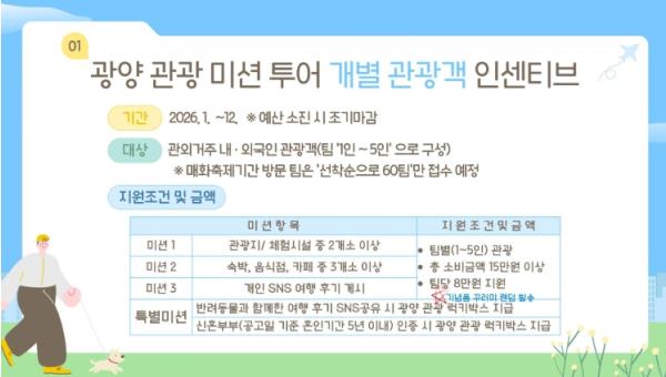 광양시 관계자는 “광양관광 미션투어는 개별·소규모 여행객이 관광지 방문과 지역 상권을 함께 즐길 수 있도록 기획된 참여형 프로그램”이라며 “반려동물 동반 여행객, 신혼부부, 캠핑족 등 다양한 수요층을 고려한 맞춤형 미션을 통해 머물고 싶은 광양관광의 매력을 지속적으로 강화해 나가겠다”고 말했다.