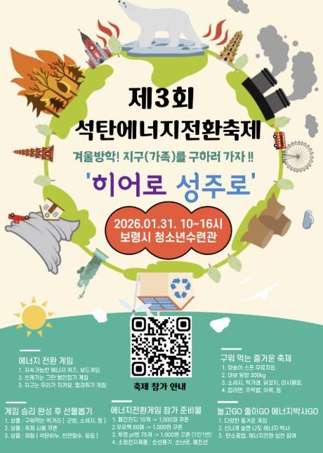 [중앙뉴스라인, 우제헌기자] 보령시가 주최하고 성주면 개화1리마을회가 주관하는 ‘제3회 겨울방학 석탄 에너지전환 축제’가 오는 1월 31일 오전 10시부터 오후 4시까지 보령시청소년수련원 일원에서 개최된다.