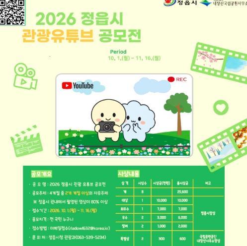 시 관계자는 “이번 공모전은 시민과 여행자의 시선으로 정읍을 새롭게 기록하고 공유하는 계기가 될 것”이라며 “영상 콘텐츠를 통해 사계절 관광도시 정읍의 매력을 전국에 확산해 나가겠다”고 했다.