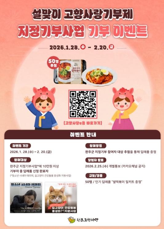 유희태 완주군수는 “기부자가 기부금 사용처를 직접 선택하는 지정기부의 취지를 알리고 참여를 넓히기 위해 이번 이벤트를 마련했다”며 “설 명절을 맞아 완주를 응원하는 마음이 청소년과 작은 생명들에게 따뜻한 희망으로 이어지길 바란다”고 말했다.
