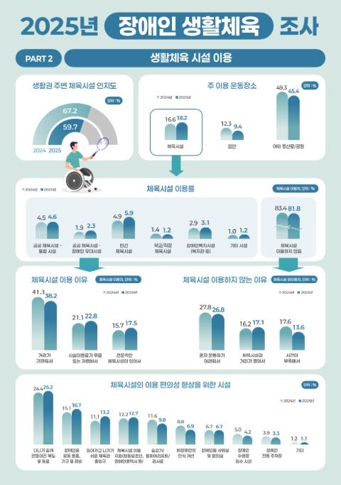평소 운동할 때 가장 지원받고 싶은 사항이 무엇인지 조사한 결과, ‘비용 지원’을 희망하는 목소리가 34.7%로 가장 높았다. 이어 ‘장애인용 운동용품 및 장비’ 15.5%, ‘장애인 생활체육 프로그램’ 15%, ‘체육시설의 장애인 편의 시설’ 12.8%, ‘장애인 생활체육 지도’ 9.1%의 순으로 조사됐다. 또한 생활권 주변에서 앞으로 이용하고 싶은 체육시설에 대해 공공 체육시설-통합 시설의 응답이 33.7%로 가장 높게 조사됐는데, 이는 전년 대비 4.9%포인트(p) 증가한 수준이다.