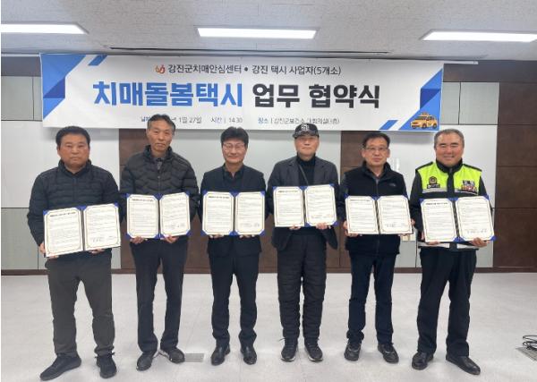 강진군보건소(강진군치매안심센터)가 지난 27일 치매환자와 이동이 불편한 주민들의 편의를 높이기 위해 관내 개인택시사업자 5명과‘ 치매돌봄택시’ 송영서비스 업무협약을 체결했다