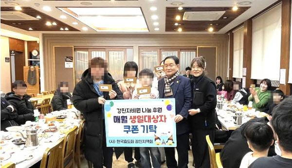 특히, 식사와 함께 생일을 맞은 아이들을 위한 깜짝 생일파티도 마련되어 특별함을 더했다. 한국효도회 강진지역회는 매달 강진자비원 아동을 위한 생일파티를 후원해오고 있으며, 이날도 1월 생일을 맞은 아이 4명을 위해 케이크와 함께 축하 노래를 불러주는 자리를 만들었다. 아울러 각 아이에게는 문화상품권이 선물로 전달되어 아이들의 얼굴에 웃음을 더했다.