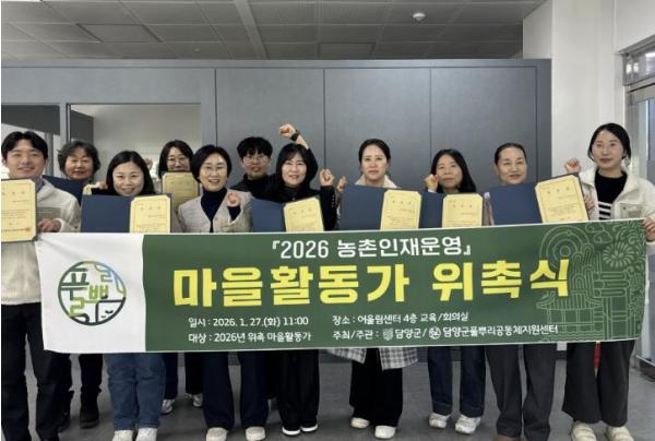 군은 지난 27일 담양군 어울림센터에서 ‘2026년 마을활동가 위촉식’을 열고, 공개 모집과 면접 심사를 거쳐 선발된 활동가들에게 위촉장을 수여했다.