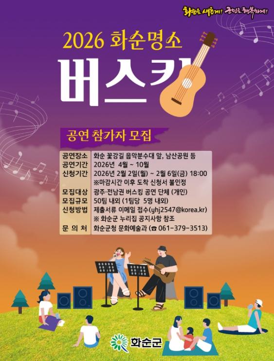[중앙뉴스라인, 전은희기자] 화순군은 29일 지역 관광 활성화와 일상 속 문화 향유 기회 확대를 위해 ‘2026 화순 명소 버스킹’에 참여할 공연자를 공개모집 한다고 밝혔다.