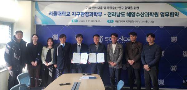 전라남도해양수산과학원(원장 김충남)과 국립대학법인 서울대학교 지구환경과학부(학부장 박록진)는 29일 서울대학교에서 ‘기후변화 대응 지속 가능한 해양수산 연구 체계 구축’을 위한 업무협약(MOU)을 했다.