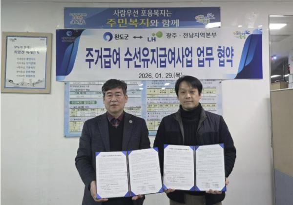 [중앙뉴스라인, 이상권기자] 완도군은 지난 29일 LH(한국토지주택공사 광주전남지역본부)와 함께 주거 급여 수급자 가구의 주거비 부담을 덜어주기 위한 업무 협약을 체결했다.