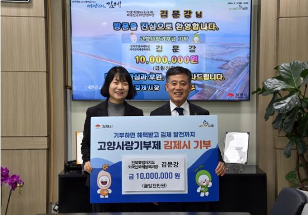 [중앙뉴스라인, 김용범기자] 김제시는 3일 전북특별자치도 외국인국제정책과 김문강 과장이 김제시 고향사랑기부제에 1,000만 원을 기탁했다고 밝혔다.