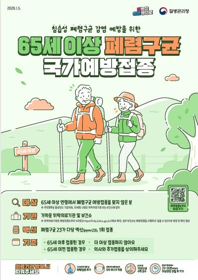 정부는 2013년부터 폐렴구균 23가 다당 백신(PPSV23) 예방접종을 국가예방접종사업으로 지원하고 있다. 1961년 12월 31일 이전 출생자 가운데 해당 백신을 한 번도 접종하지 않은 어르신은 건강 상태가 좋을 때 가까운 보건소 또는 지정의료기관에서 무료로 1회 접종할 수 있다. 이미 접종한 경우에는 추가 접종이 필요하지 않다.