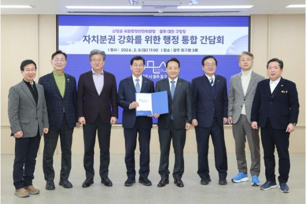 광주광역시구청장협의회는 8일 광주 동구청에서 대전광역시 중구청장·유성구청장과 함께 신정훈 국회 행정안전위원장과 간담회를 갖고, 광역 행정통합 추진 방향과 관련해 자치구의 자치권이 실질적으로 보장될 수 있도록 통합특별법에 반영해 줄 것을 건의했다고 밝혔다.